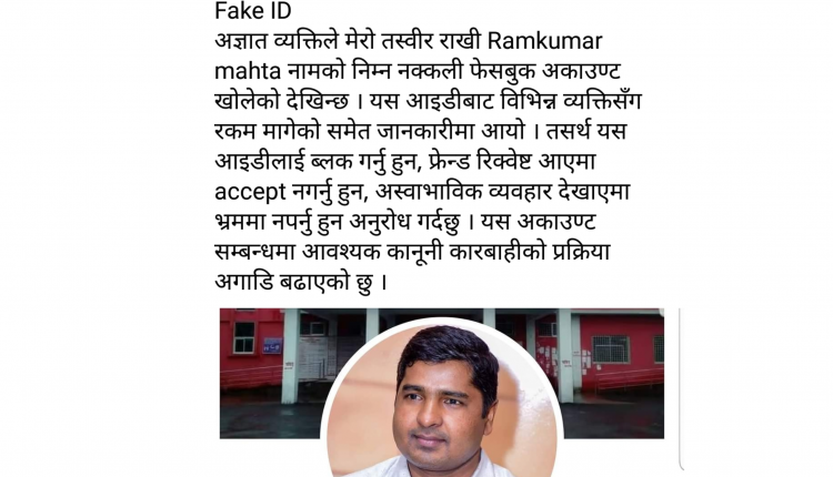 “अज्ञात व्यक्तिले मेरो तस्बीर राखी नक्कली फेसबुक एकाउन्ट खोलेको देखिन्छ, फेक आइडीबाट विभिन्न व्यक्तिबाट रकम माग गरेको समेत जानकारीमा आयो”, उनले सामाजिक सञ्जाल फेसबुकमा लेख्दै भनेका छन् “यस आइडीलाई ब्लक गर्न हुन, फ्रेन्ड रिक्वेस्ट आएमा नगर्न हुन, अस्वाभाविक व्यवहार देखाएमा भ्रममा नपर्न हुन अनुरोध गर्दछु, यस एकाउन्ट सम्बन्धमा आवश्यक कानूनी कार्वाहीको प्रक्रिया अगाडि बढाएको छु ।”