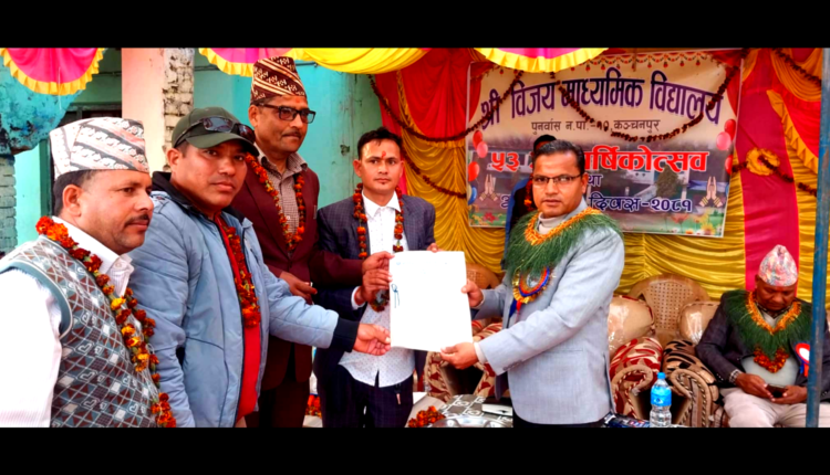 पुनर्वास नगरपालिका-१०, भिम विकास बस्तीस्थित श्री विजय माध्यमिक विद्यालयले आफ्नो शुक्रबार ५३औँ वार्षिकोत्सव तथा अभिभावक दिवस भव्य रूपमा सम्पन्न गरेको छ। यस अवसरमा सुदूरपश्चिम प्रदेश सरकारका भूमि व्यवस्था, कृषि तथा सहकारी मन्त्री माननीय वीर बहादुर थापा प्रमुख अतिथिको रूपमा उपस्थित हुनुहुन्थ्यो।