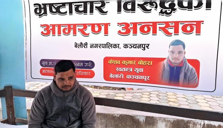 बेलौरी नगरपालिकामा व्याप्त भ्रष्टाचार, बेथिति र कुशासनको विरोधमा एक युवाले आमरण अनशन सुरु गरेका छन्। बेलौरी नगरपालिका–स्थित भिमदत्त चोक (पिपल चौतारा) मा मंगलबारदेखि स्थानीय युवा केशव कुमार बोहरा विभिन्न मागहरू अघि सार्दै शान्तिपूर्ण आमरण अनशनमा बसेका हुन्।