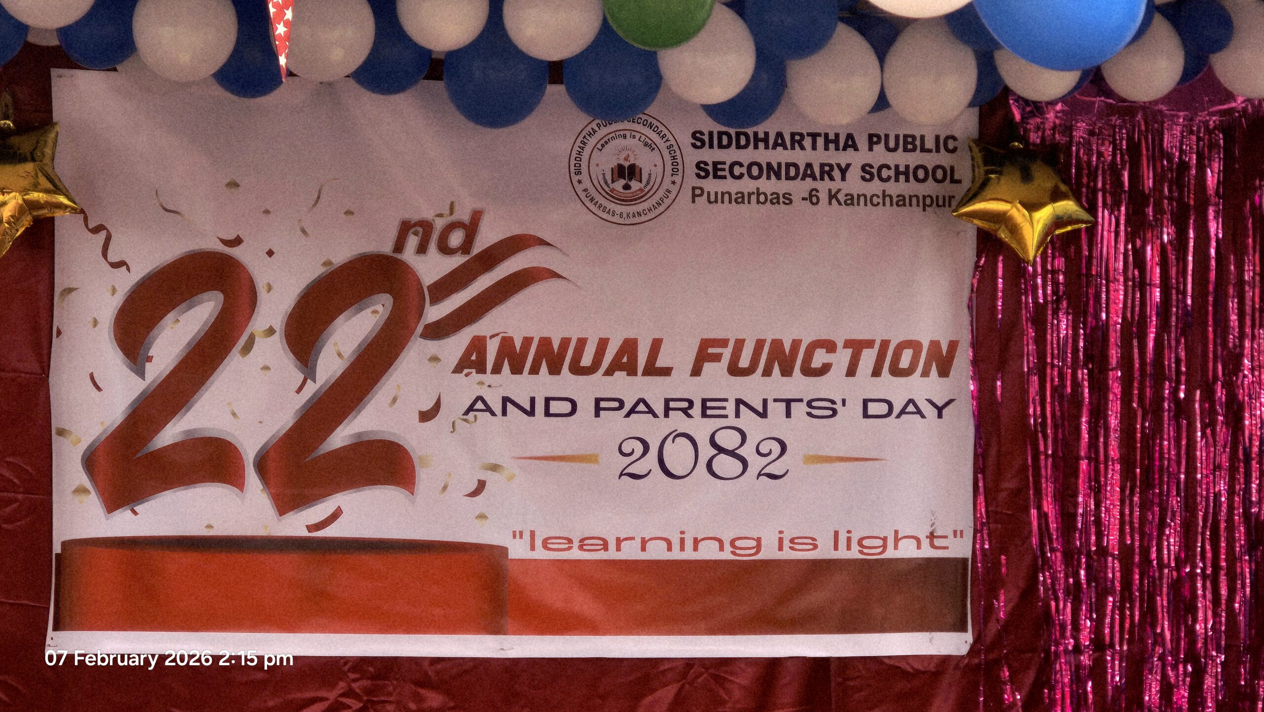 पुनर्वास–६ स्थित सिद्धार्थ पब्लिक स्कूलले सनिवार विद्यालय प्राङ्गणमा २२औँ वार्षिकोत्सव तथा अभिभावक दिवस कार्यक्रम धुमधामका साथ सम्पन्न गरेको छ।